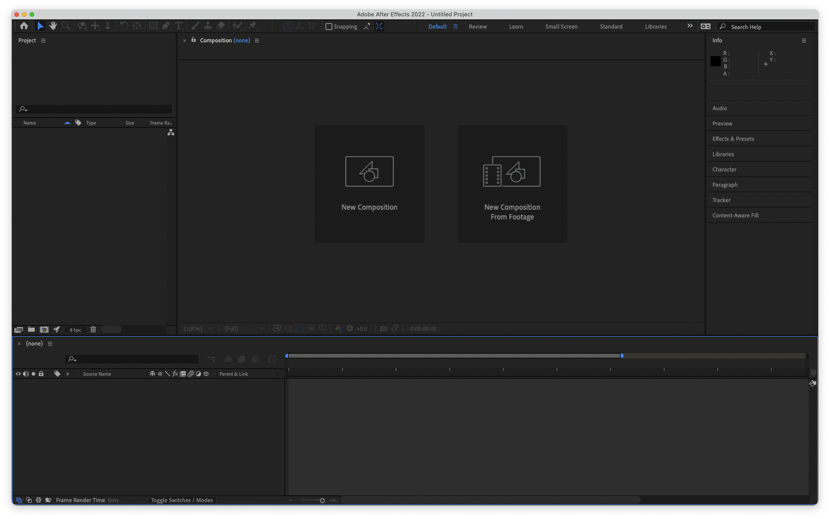 Design your animation in After Effects. In this basic example, we used the rounded rectangle tool to draw a blue rounded square and then opened the transform menu and clicked the stopwatch icon to set keyframes for position and rotation to create a simple entrance effect.